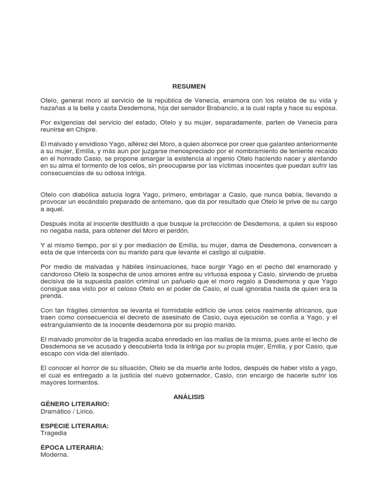 Acto i en la primera escena van rodrigo y yago caminando. Además, los pasos para realizar uno y un ejemplo de resumen. Resumen del otelo para comenzar con la historia del producto. En este caso, la trama gira en torno a otelo, un príncipe negro respetado y querido por la sociedad de venecia por sus. Tras triunfar en varias batallas es nombrado gobernador de chipre que pertenecía en esa época a venecia.